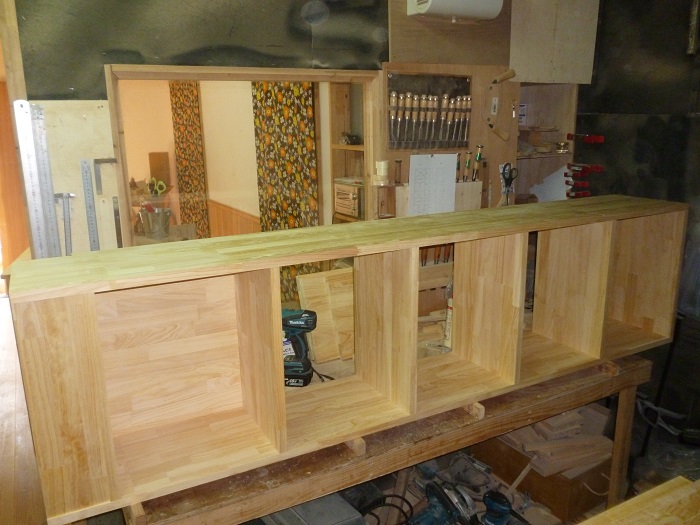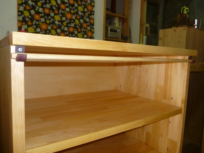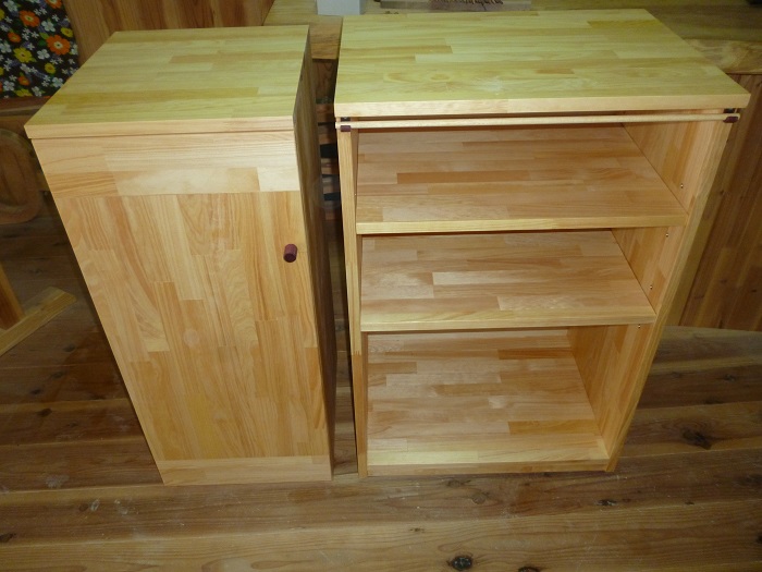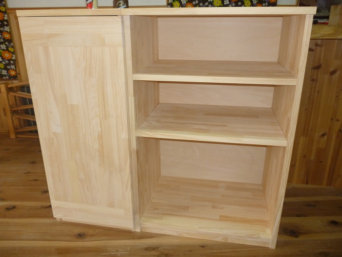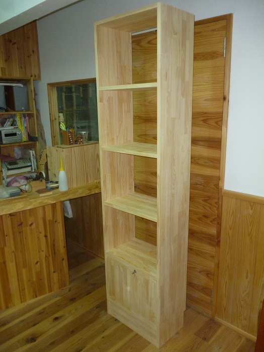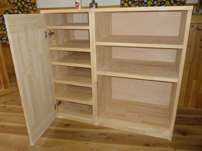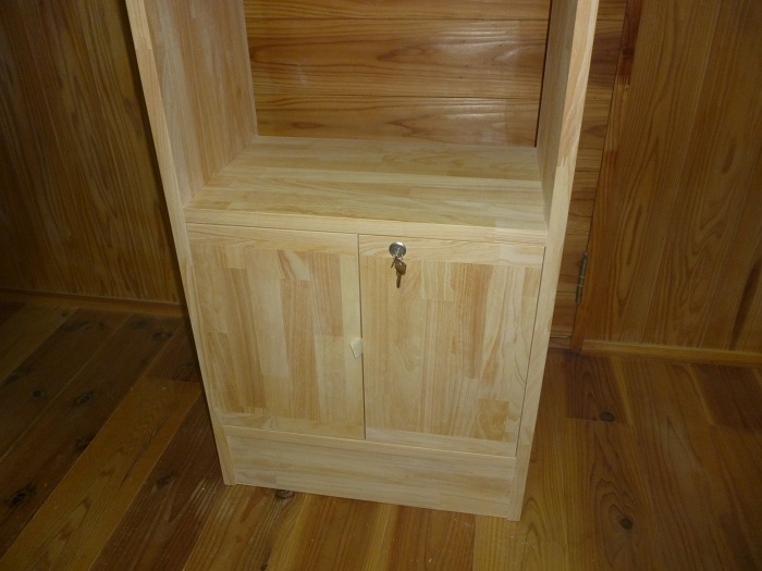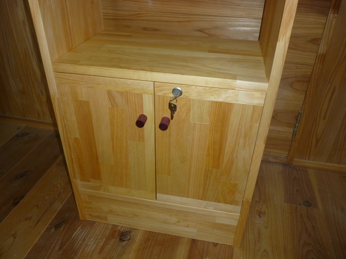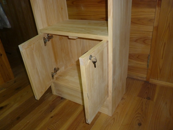 下の1段だけがインセットの扉つきの収納ボックスになっています。鍵付きです。あとはオープン棚です。